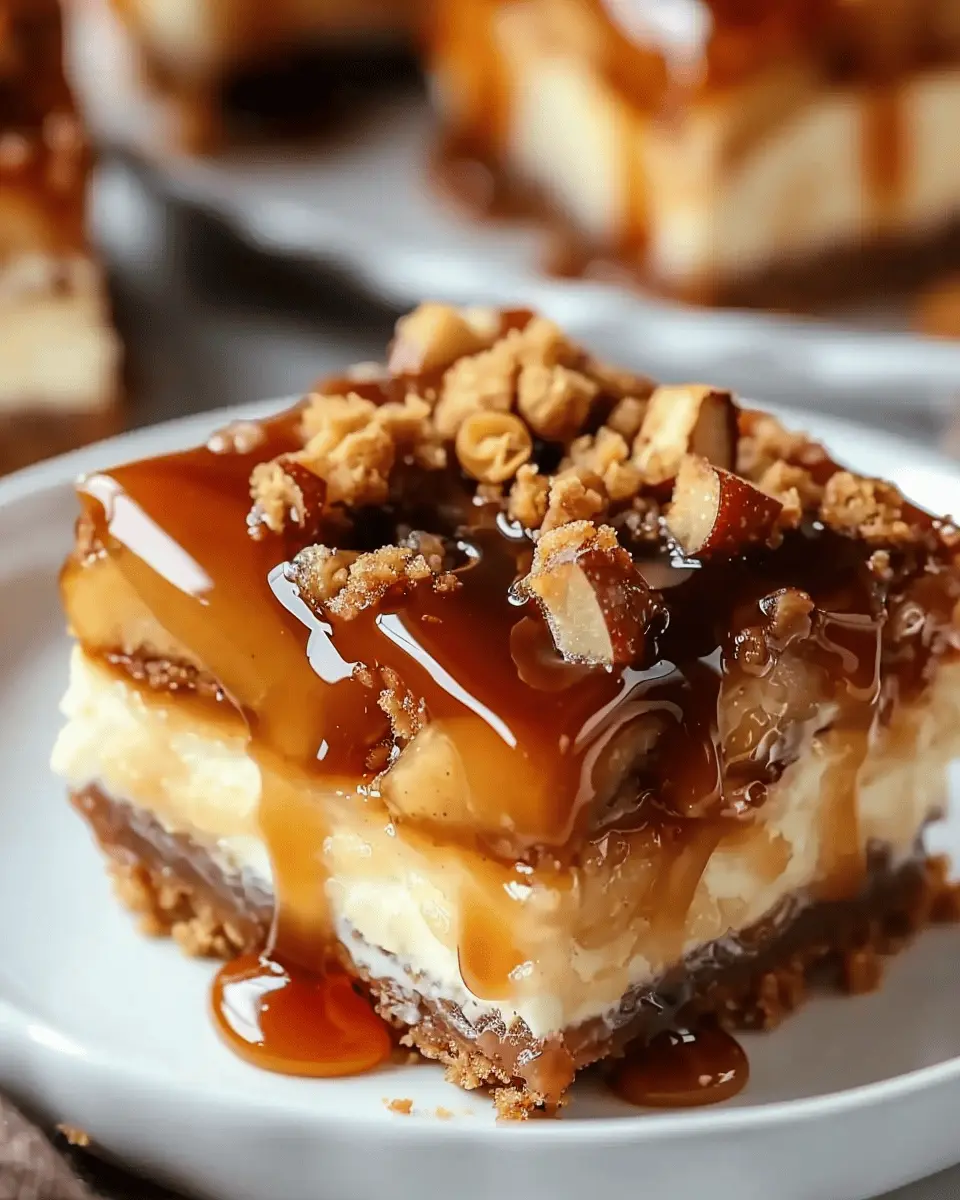 Delicious Caramel Apple Cheesecake Bars that blend the flavors of caramel and apple in a creamy cheesecake.