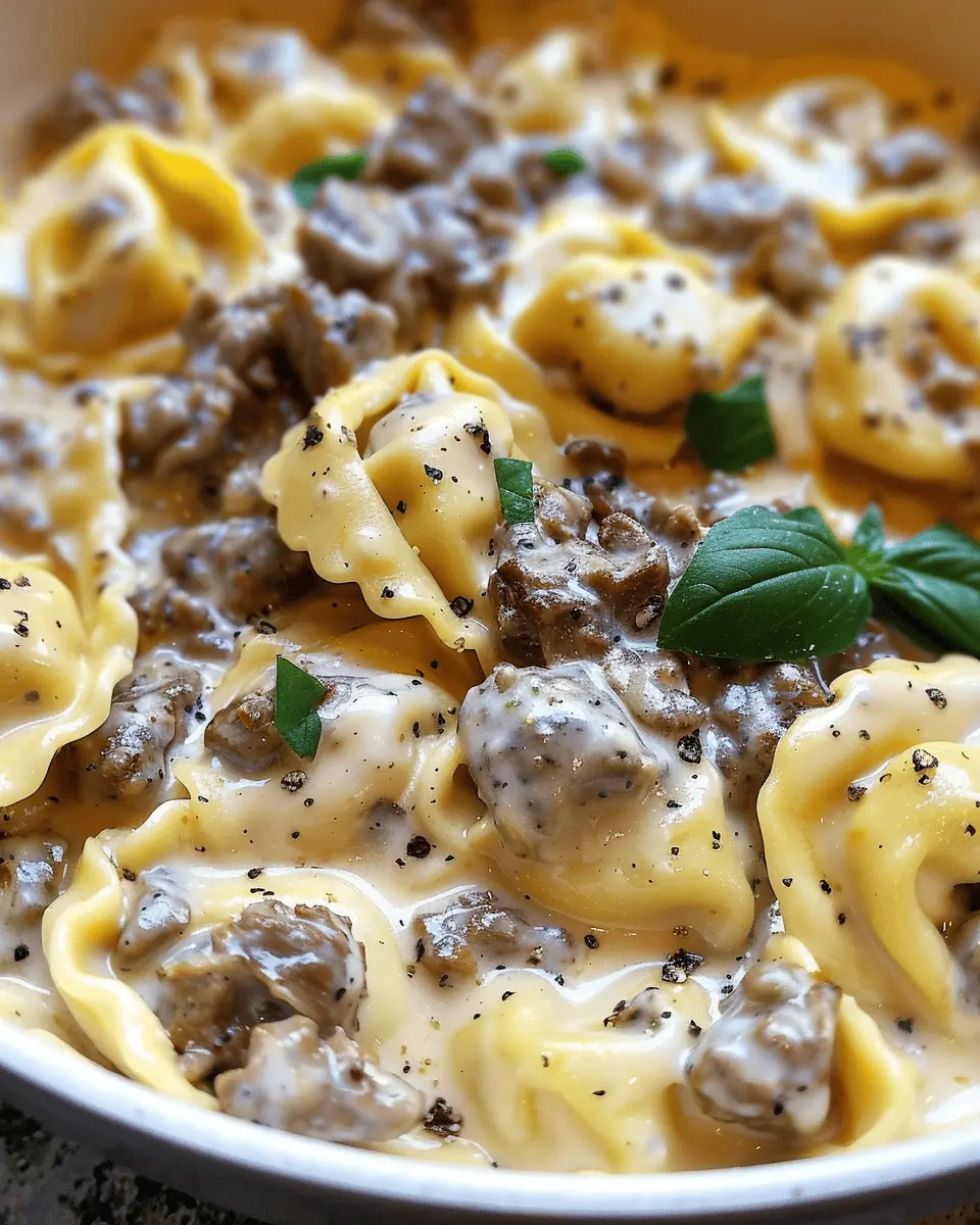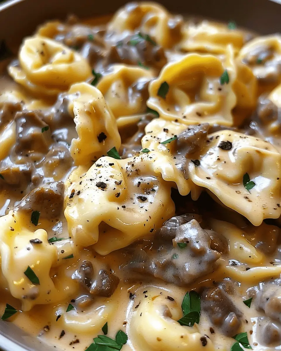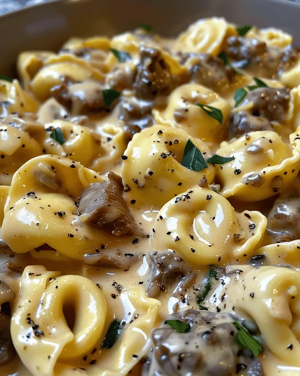 A creamy, comforting dish that combines the flavors of a classic cheesesteak with tortellini.
