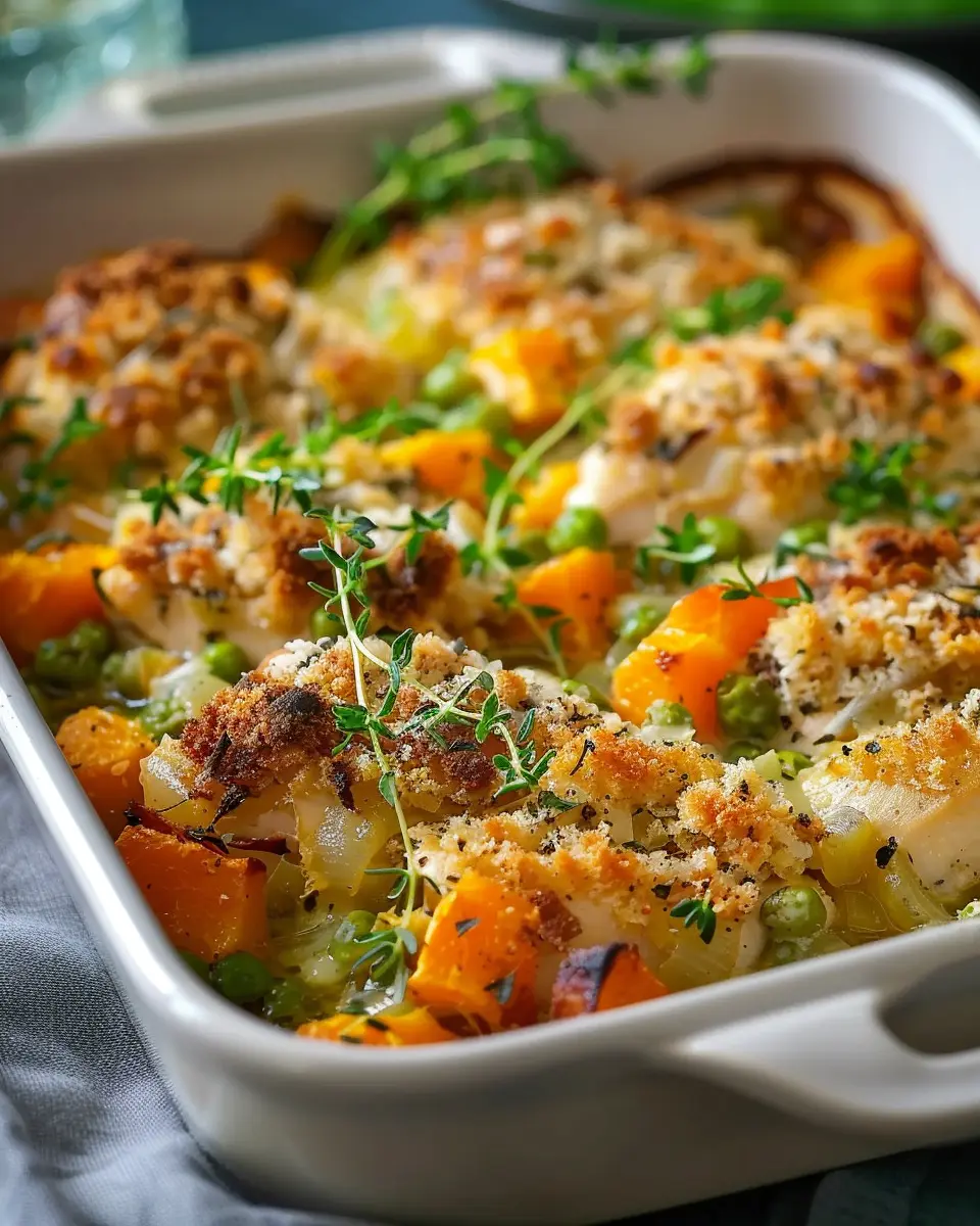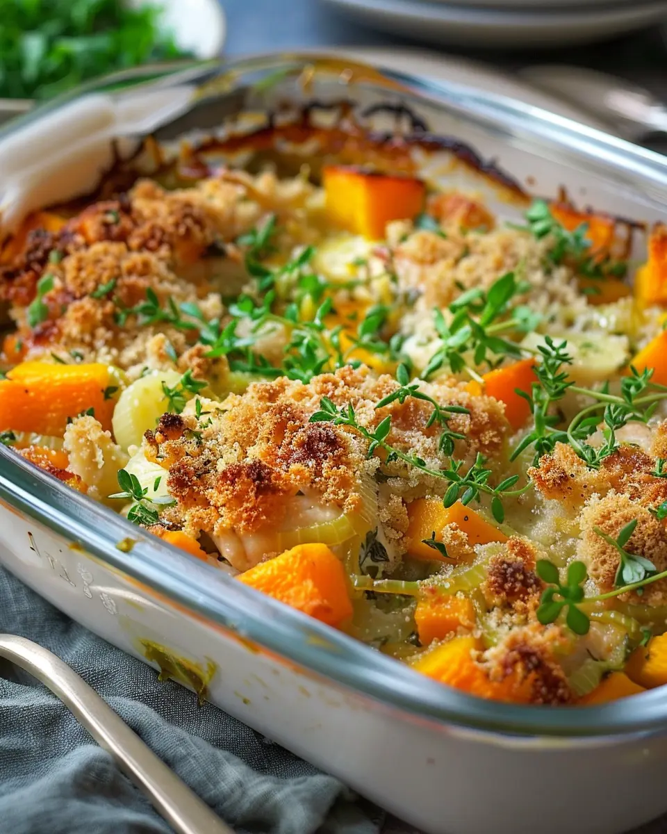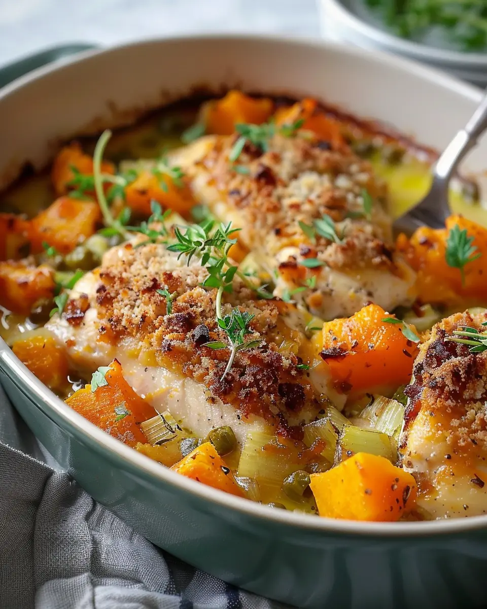 Indulge in this hearty Chicken Leek and Butternut Squash Bake, perfect for a cozy meal.