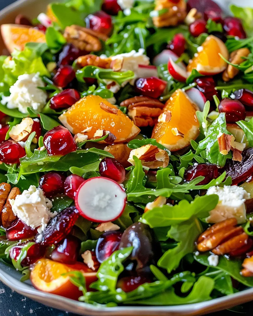 Your Christmas Salad is finally ready to shine! Serve it immediately for the freshest taste, garnishing with any leftover nuts or cheese you saved. Pair it with a refreshing non-alcoholic drink like sparkling water infused with citrus slices to balance the savory elements of the salad.