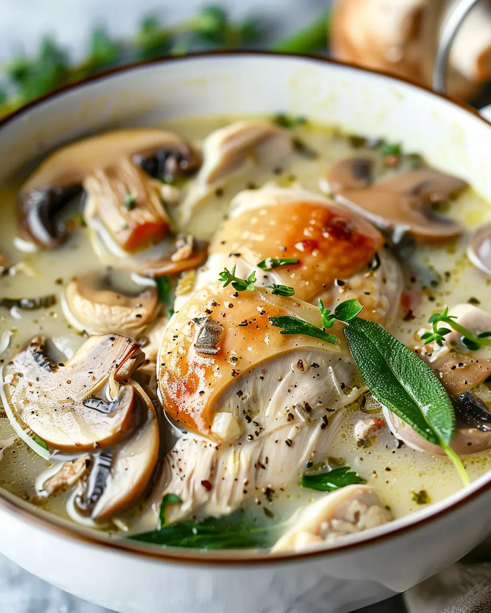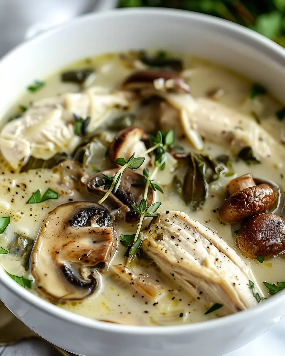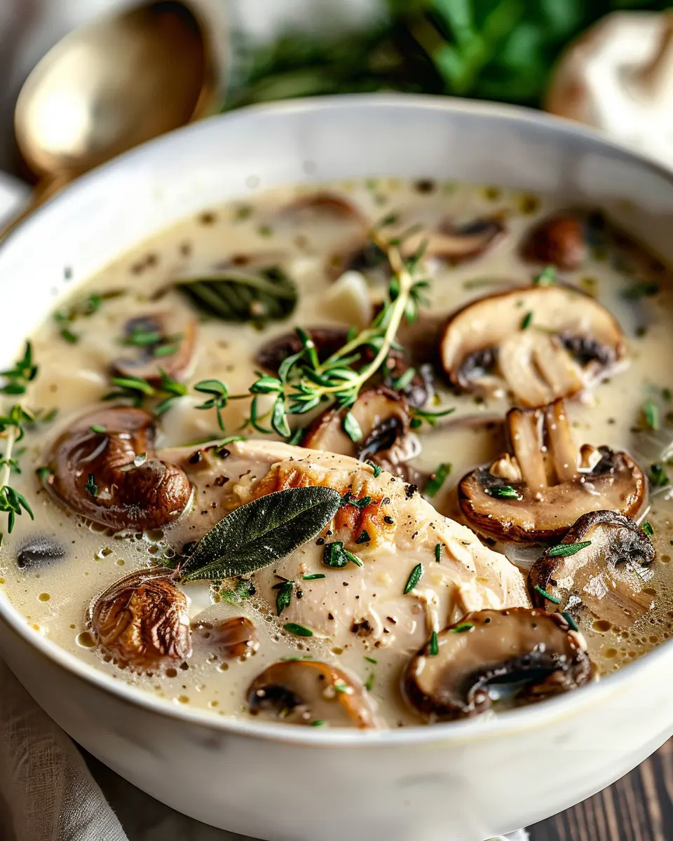 Enjoy a warm, delightful bowl of Comforting Rotisserie Chicken and Mushroom Soup that combines tender chicken with rich mushrooms for a heartwarming experience.