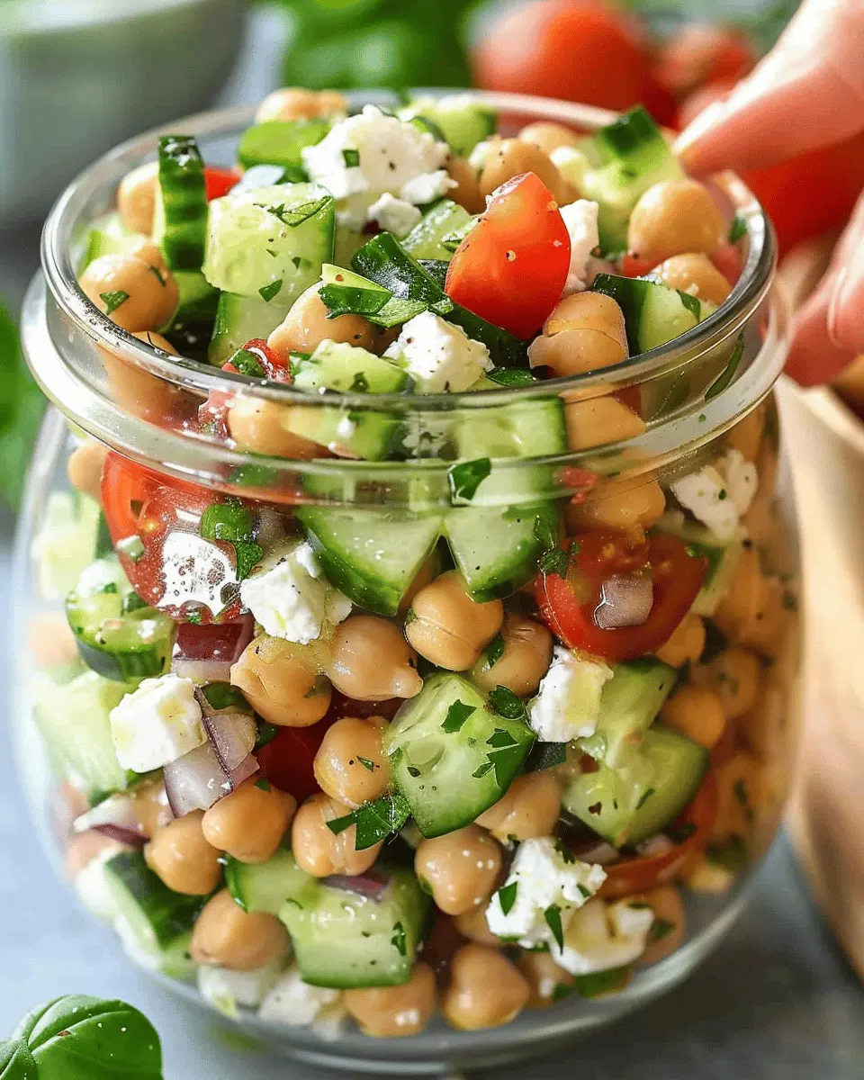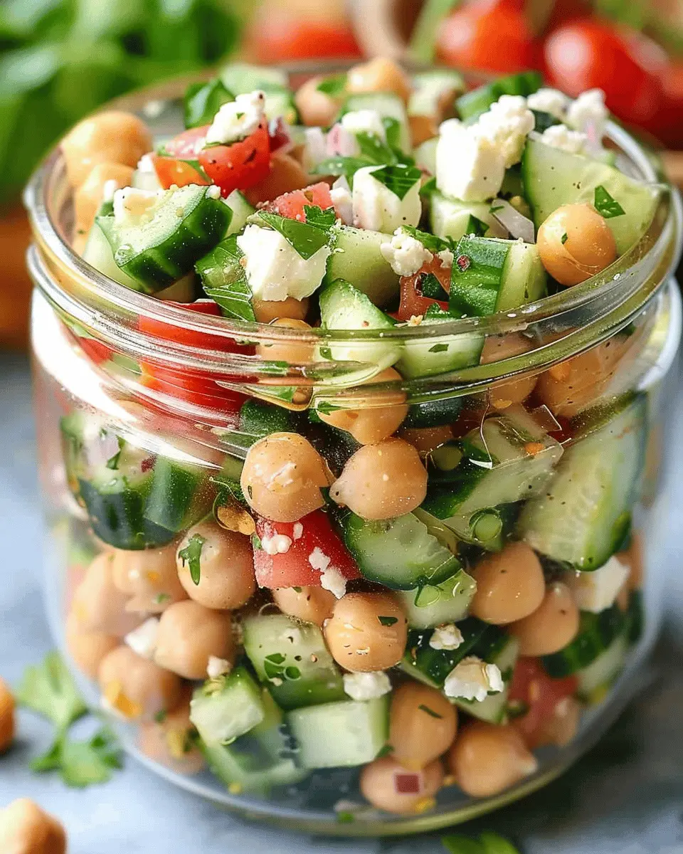 A refreshing salad combining chickpeas, cucumber, feta, and tomatoes for a delightful dish.