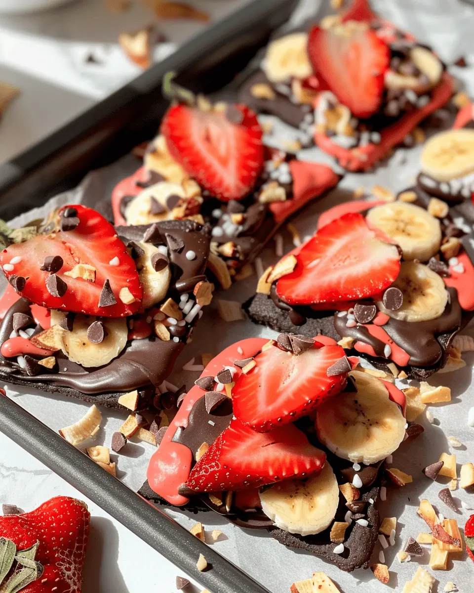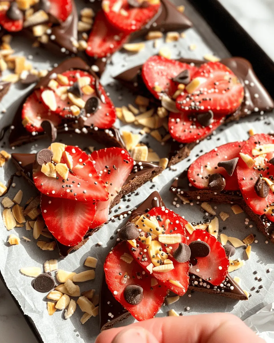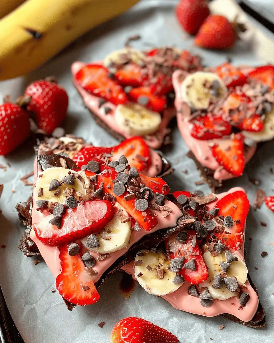 One enjoyable method is to break the bark into bite-sized pieces and toss them into a fruit salad for an unexpected crunch and sweetness. You can also layer the chocolate bark with granola for a quick and satisfying parfait. Imagine diving into layers of creamy yogurt, crunchy granola, and vibrant strawberry banana flavors — the perfect combination for breakfast or dessert!