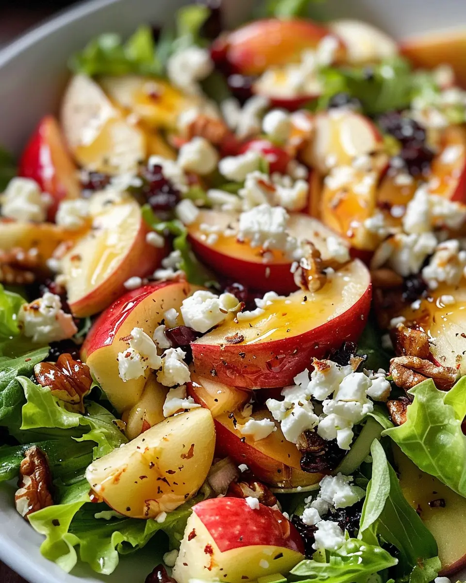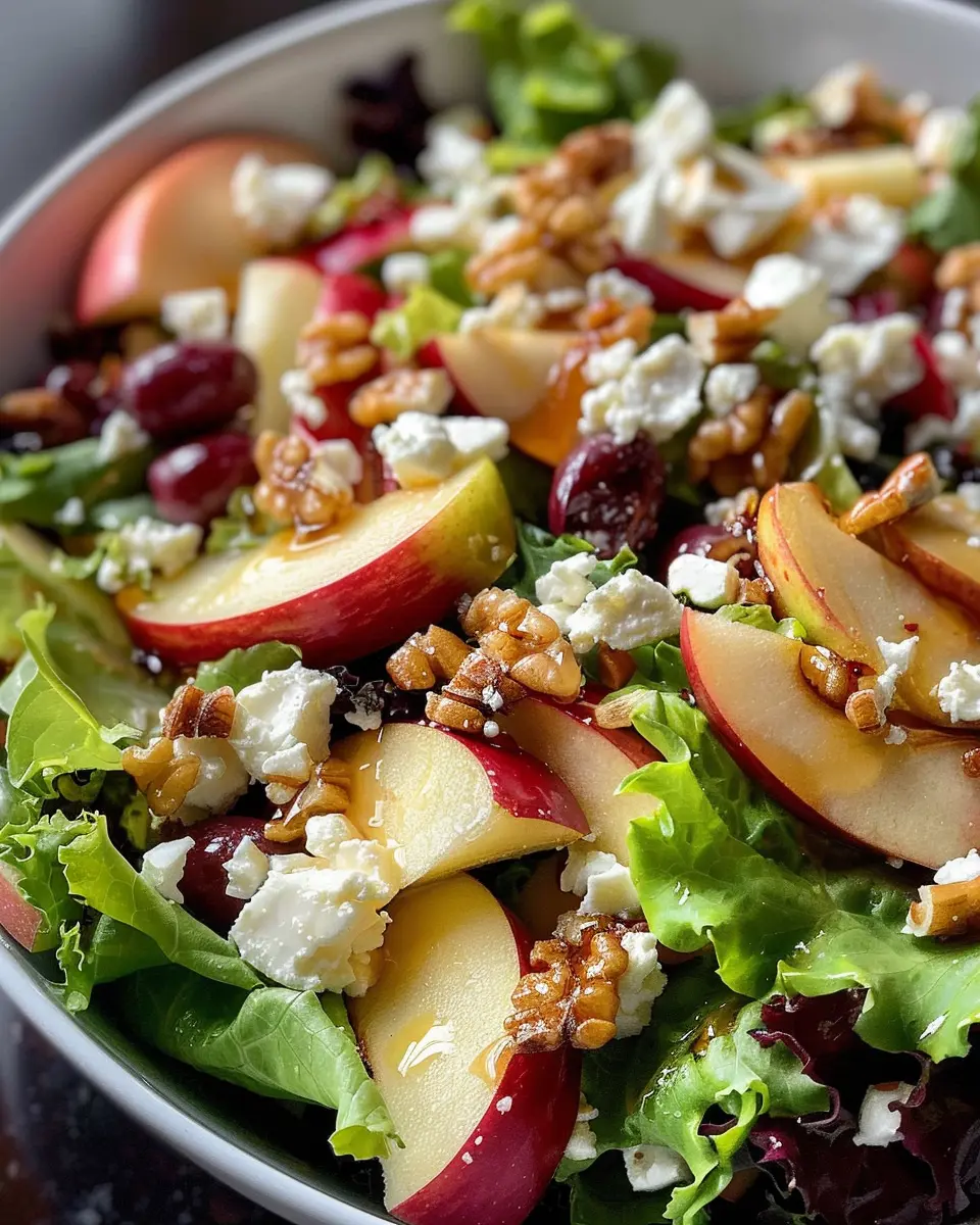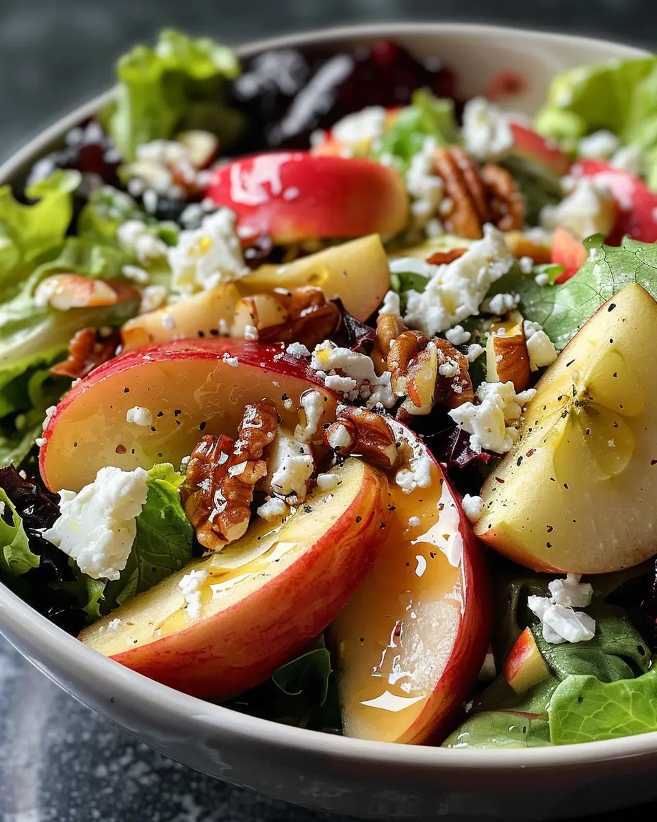 - In a large bowl, combine mixed greens, sliced apples, crumbled feta, and walnuts.