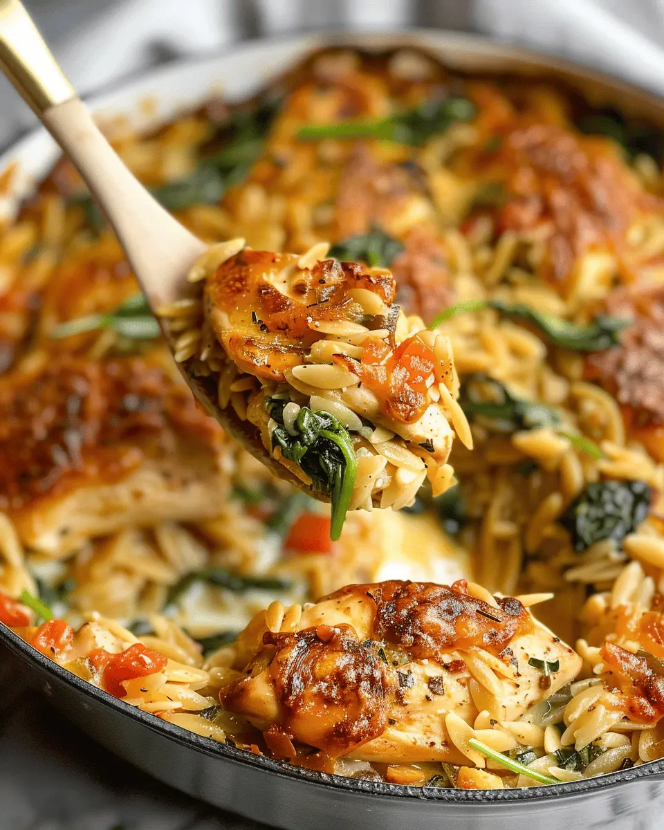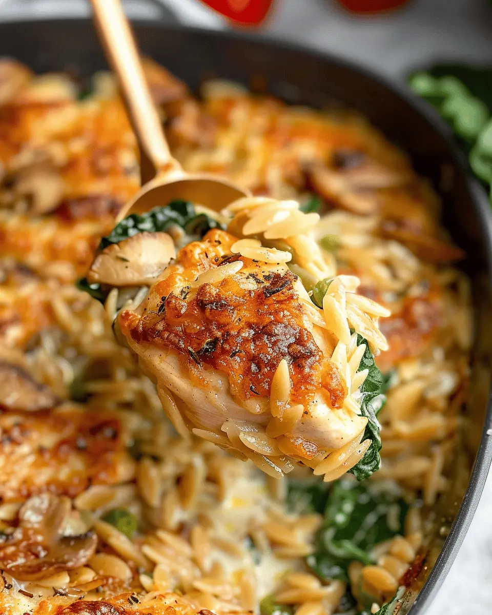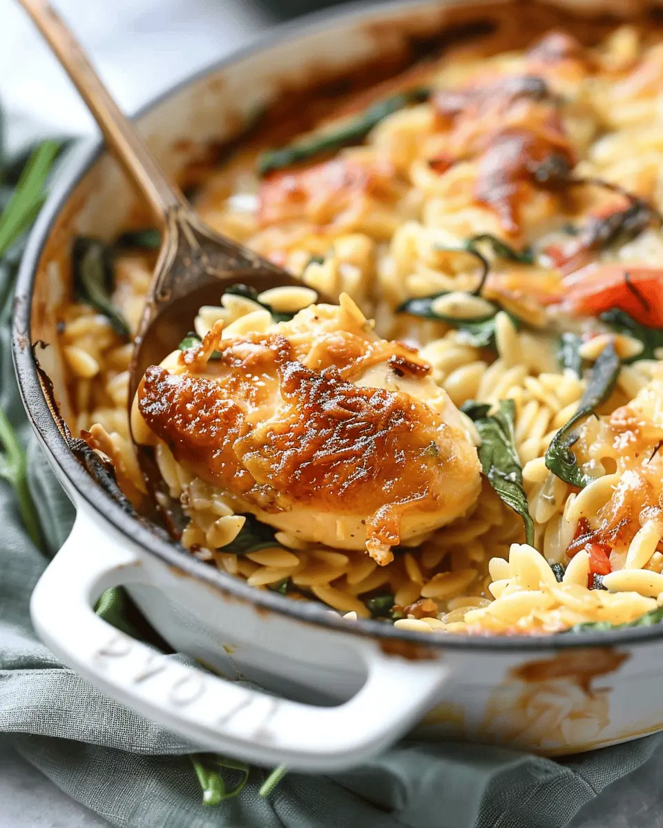 A delightful one-pan meal featuring chicken and orzo, perfect for a cozy dinner.