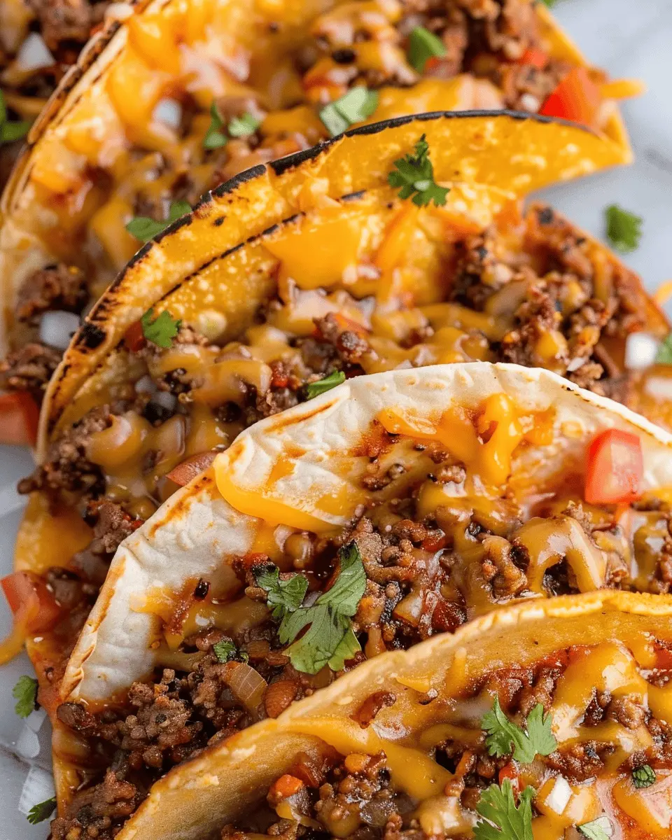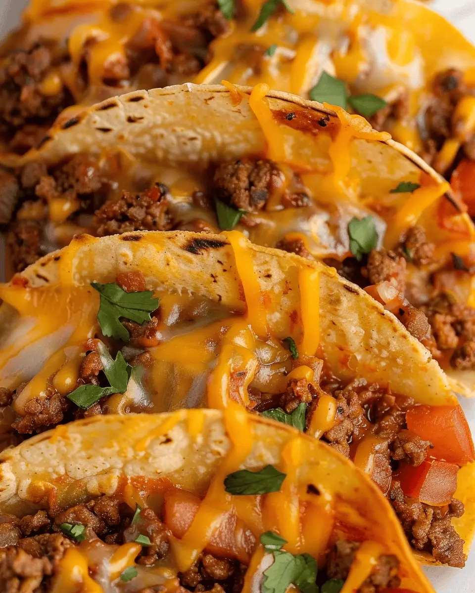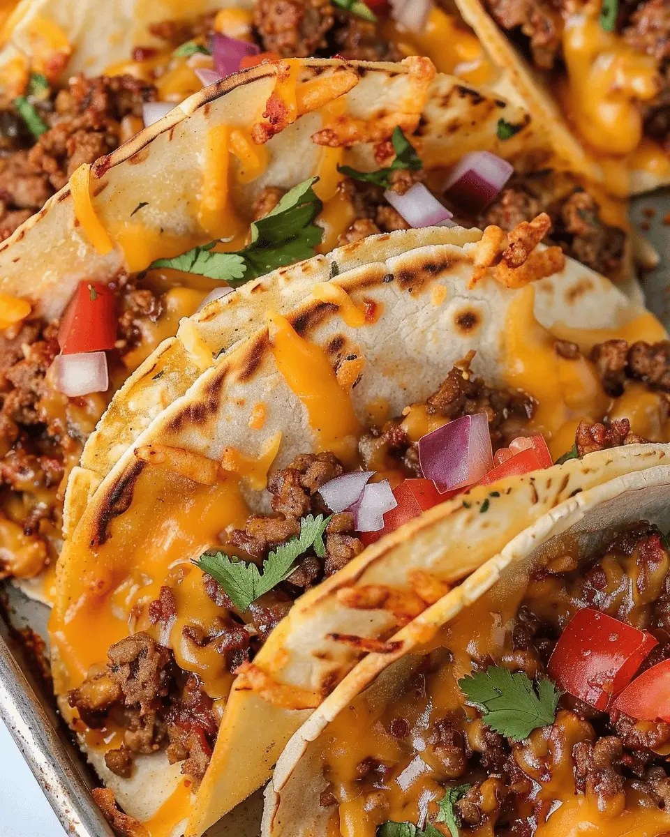 Now the fun part! Grab your prepared baking sheet and start laying out the tortillas. Fill each tortilla with a generous scoop of your beef mixture. It’s okay to be a little messy here; tacos are meant to be enjoyed! Top your filled tortillas with shredded cheese—cheddar, Monterey Jack, or even a spicy pepper jack are all fantastic options!